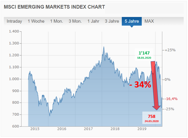 - In einem Bärenmarkt geht die Abwärtsbewegung viel schneller vonstatten, als in einem Bullenmarkt die Kurse steigen. So notiert der MSCI Emerging Market aktuell (3.4.2020), d.h. unter Berücksichtigung der jüngsten Aufwärtsbewegung sogar 16,4% tiefer als vor fünf Jahren (vgl. Abbildung 2). MSCI World und SMI befinden sich mehr oder weniger auf 5-Jahresniveau (vgl. Abbildungen 1 und 3). Einzig der auf US-amerikanische Unternehmen beschränkte S&P 500 liegt mit 19,6% noch recht deutlich darüber (vgl. Abbildung 4).