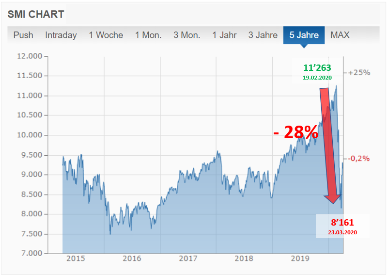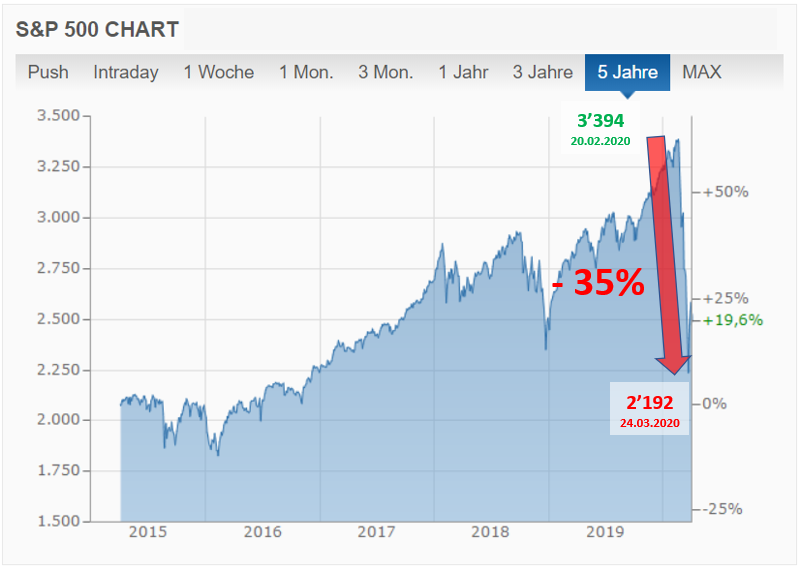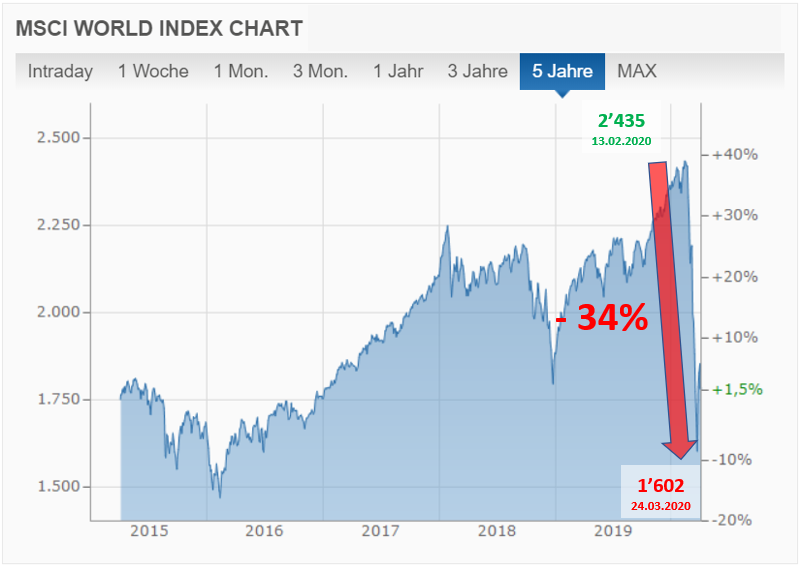 Kurz: Grosse Teile der Menschheit befinden sich im Krisenmodus und eine ausgewachsene, globale Rezession steht uns ins Haus. Und damit gelangen wir zum eigentlichen Thema, nämlich die finanzielle Situation für uns Anleger.